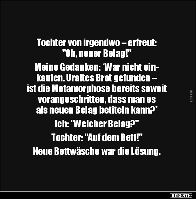 Tochter von irgendwo – erfreut: "Oh, neuer Belag!" Meine Gedanken: *War nicht ein- kaufen. Uraltes Brot gefunden – ist die Metamorphose bereits soweit vorangeschritten, dass man es als neuen Belag betiteln kann?* Ich: "Welcher Belag?" Tochter: "Auf dem Bett!" Neue Bettwäsche war die Lösung.