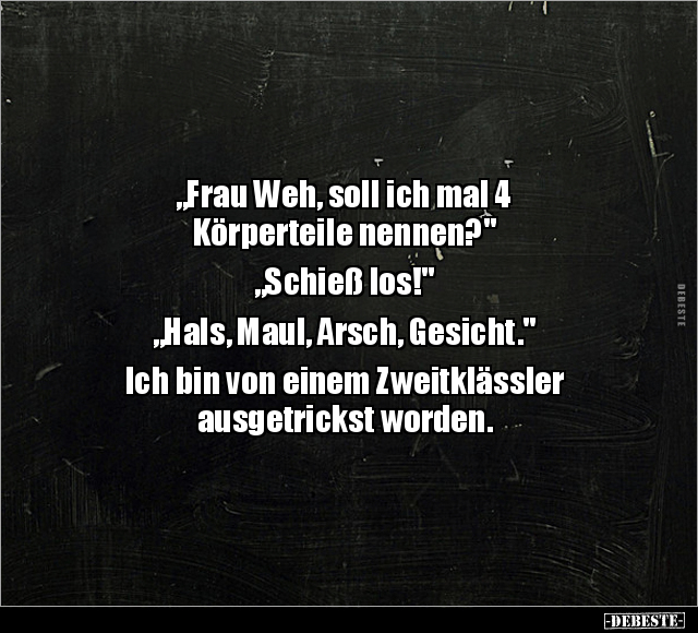 „Frau Weh, soll ich mal 4 Körperteile nennen?" „Schieß los!" „Hals, Maul, Arsch, Gesicht." Ich bin von einem Zweitklässler ausgetrickst worden.