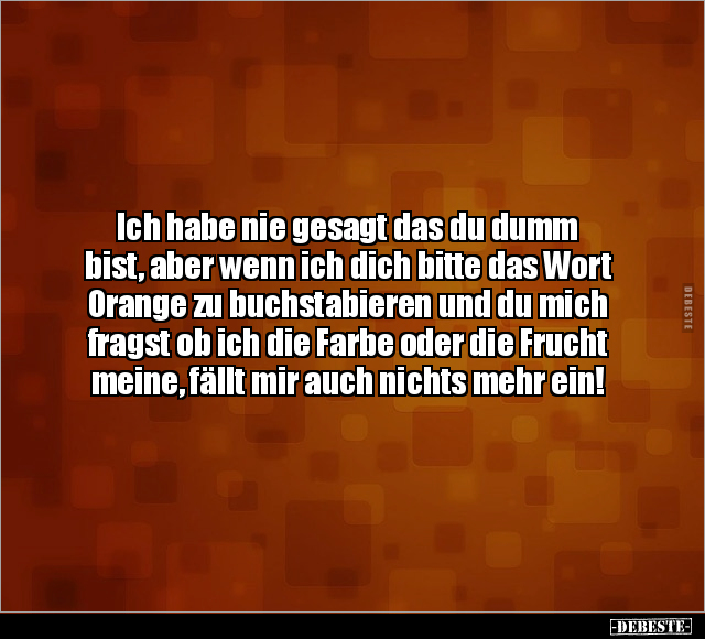 Ich habe nie gesagt das du dumm bist, aber wenn ich dich bitte das Wort Orange zu buchstabieren und du mich fragst ob ich die Farbe oder die Frucht meine, fällt mir auch nichts mehr ein!