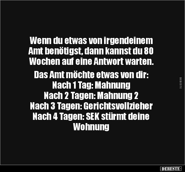 Wenn du etwas von irgendeinem Amt benötigst, dann kannst du 80 Wochen auf eine Antwort warten. Das Amt möchte etwas von dir: Nach 1 Tag: Mahnung Nach 2 Tagen: Mahnung 2 Nach 3 Tagen: Gerichtsvollzieher Nach 4 Tagen: SEK stürmt deine Wohnung