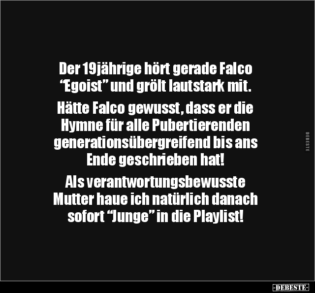 Der 19jährige hört gerade Falco “Egoist” und grölt lautstark mit. Hätte Falco gewusst, dass er die Hymne für alle Pubertierenden generationsübergreifend bis ans Ende geschrieben hat! Als verantwortungsbewusste Mutter haue ich natürlich danach sofort “Junge” in die Playlist!