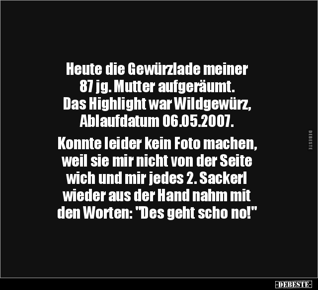 Heute die Gewürzlade meiner 87 jg. Mutter aufgeräumt. Das Highlight war Wildgewürz, Ablaufdatum 06.05.2007. Konnte leider kein Foto machen, weil sie mir nicht von der Seite wich und mir jedes 2. Sackerl wieder aus der Hand nahm mit den Worten: "Des geht scho no!"