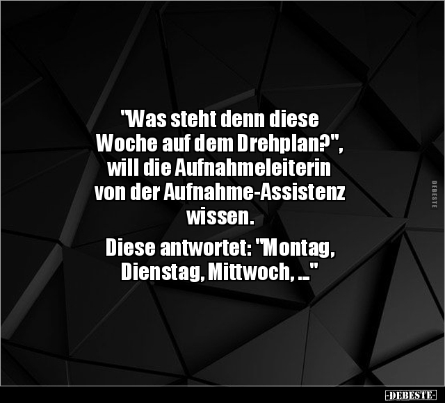"Was steht denn diese Woche auf dem Drehplan?", will die Aufnahmeleiterin von der Aufnahme-Assistenz wissen. Diese antwortet: "Montag, Dienstag, Mittwoch, ..."