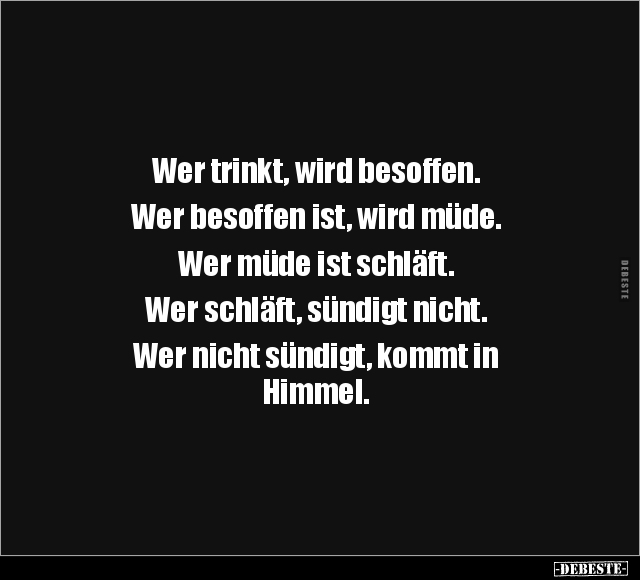 Wer trinkt, wird besoffen. Wer besoffen ist, wird müde. Wer müde ist schläft. Wer schläft, sündigt nicht. Wer nicht sündigt, kommt in Himmel.