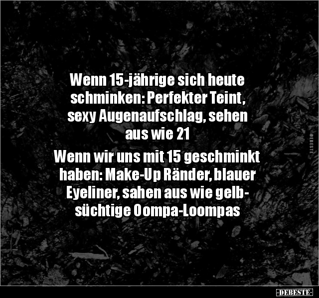 Wenn 15-jährige sich heute schminken: Perfekter Teint, sexy Augenaufschlag, sehen aus wie 21 Wenn wir uns mit 15 geschminkt haben: Make-Up Ränder, blauer Eyeliner, sahen aus wie gelb- süchtige Oompa-Loompas
