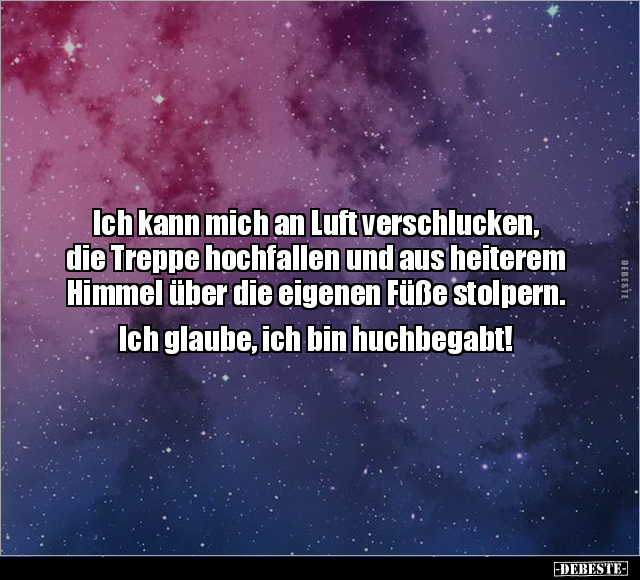 Ich kann mich an Luft verschlucken, die Treppe hochfallen und aus heiterem Himmel über die eigenen Füße stolpern. Ich glaube, ich bin huchbegabt!