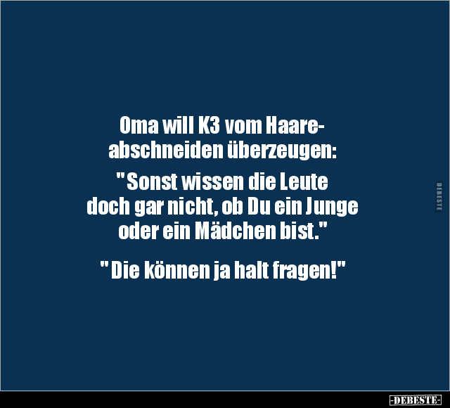 Oma will K3 vom Haare- abschneiden überzeugen: " Sonst wissen die Leute doch gar nicht, ob Du ein Junge oder ein Mädchen bist." " Die können ja halt fragen!"