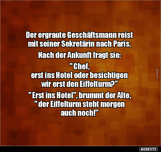 Der ergraute Geschäftsmann reist mit seiner Sekretärin nach Paris. Nach der Ankunft fragt sie: " Chef, erst ins Hotel oder besichtigen wir erst den Eiffelturm?" " Erst ins Hotel", brummt der Alte, " der Eiffelturm steht morgen auch noch!"