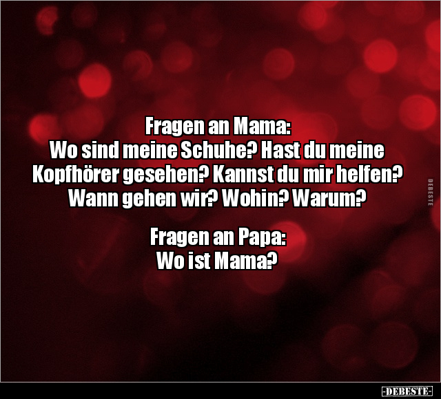 Fragen an Mama: Wo sind meine Schuhe? Hast du meine Kopfhörer gesehen? Kannst du mir helfen? Wann gehen wir? Wohin? Warum? Fragen an Papa: Wo ist Mama?