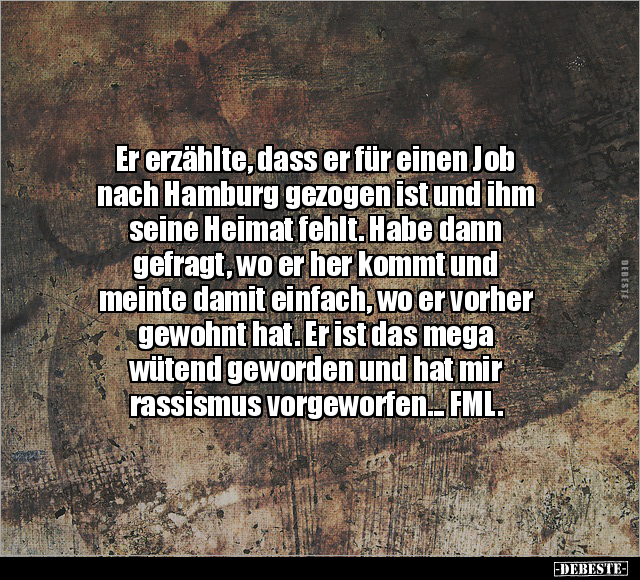 Er erzählte, dass er für einen Job nach Hamburg gezogen ist und ihm seine Heimat fehlt. Habe dann gefragt, wo er her kommt und meinte damit einfach, wo er vorher gewohnt hat. Er ist das mega wütend geworden und hat mir rassismus vorgeworfen... FML.
