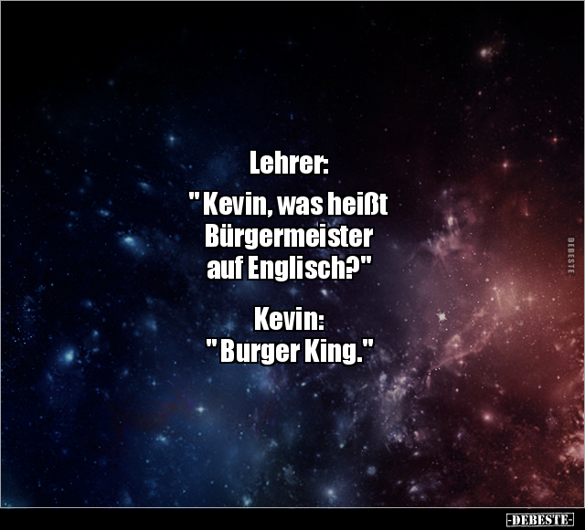 Lehrer: " Kevin, was heißt Bürgermeister auf Englisch?" Kevin: " Burger King."