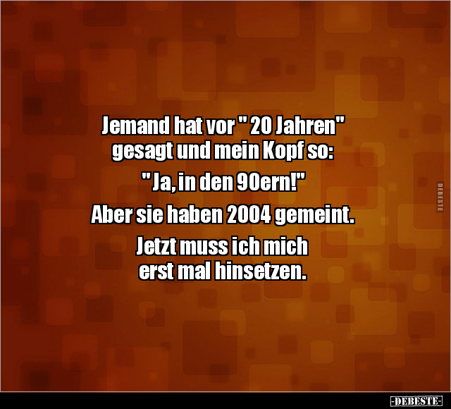 Jemand hat vor " 20 Jahren" gesagt und mein Kopf so: " Ja, in den 90ern!" Aber sie haben 2004 gemeint. Jetzt muss ich mich erst mal hinsetzen.
