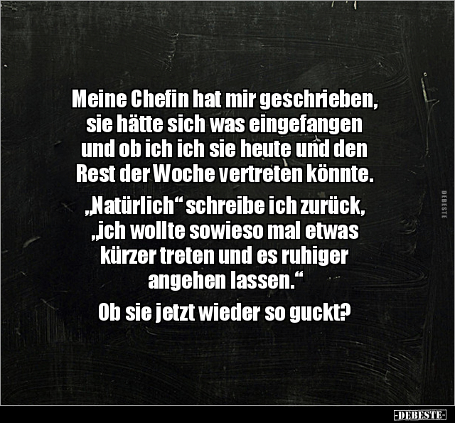 Meine Chefin hat mir geschrieben, sie hätte sich was eingefangen und ob ich ich sie heute und den Rest der Woche vertreten könnte. „Natürlich“ schreibe ich zurück, „ich wollte sowieso mal etwas kürzer treten und es ruhiger angehen lassen.“ Ob sie jetzt wieder so guckt?