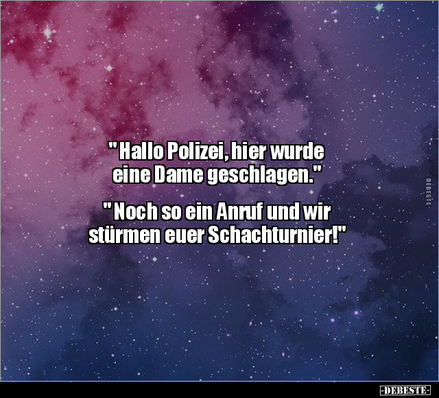 " Hallo Polizei, hier wurde eine Dame geschlagen." " Noch so ein Anruf und wir stürmen euer Schachturnier!"