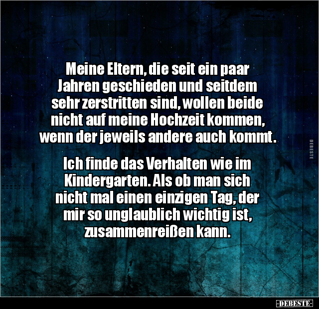 Meine Eltern, die seit ein paar Jahren geschieden und seitdem sehr zerstritten sind, wollen beide nicht auf meine Hochzeit kommen, wenn der jeweils andere auch kommt. Ich finde das Verhalten wie im Kindergarten. Als ob man sich nicht mal einen einzigen Tag, der mir so unglaublich wichtig ist, zusammenreißen kann.