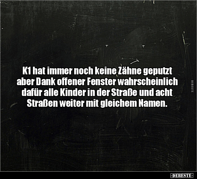 K1 hat immer noch keine Zähne geputzt aber Dank offener Fenster wahrscheinlich dafür alle Kinder in der Straße und acht Straßen weiter mit gleichem Namen.