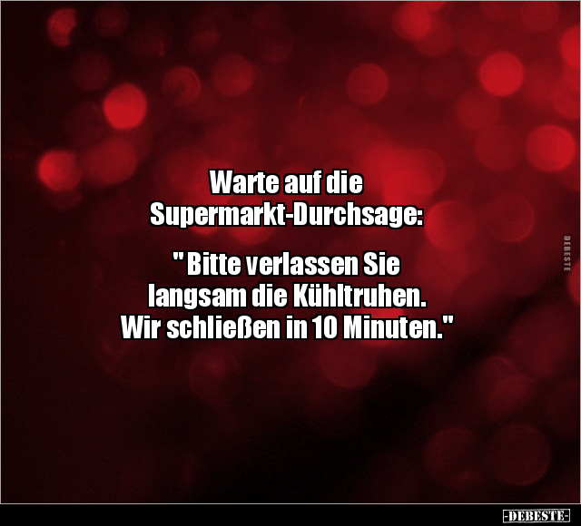 Warte auf die Supermarkt-Durchsage: " Bitte verlassen Sie langsam die Kühltruhen. Wir schließen in 10 Minuten."