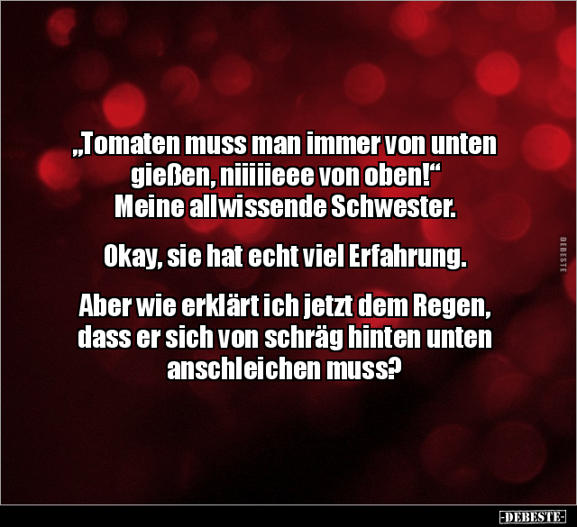 „Tomaten muss man immer von unten gießen, niiiiieee von oben!“ Meine allwissende Schwester. Okay, sie hat echt viel Erfahrung. Aber wie erklärt ich jetzt dem Regen, dass er sich von schräg hinten unten anschleichen muss?
