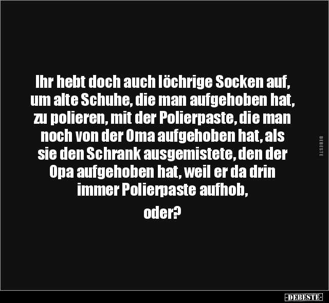 Ihr hebt doch auch löchrige Socken auf, um alte Schuhe, die man aufgehoben hat, zu polieren, mit der Polierpaste, die man noch von der Oma aufgehoben hat, als sie den Schrank ausgemistete, den der Opa aufgehoben hat, weil er da drin immer Polierpaste aufhob, oder?