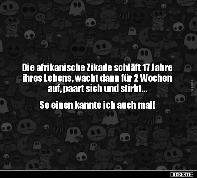 Die afrikanische Zikade schläft 17 Jahre ihres Lebens, wacht dann für 2 Wochen auf, paart sich und stirbt... So einen kannte ich auch mal!