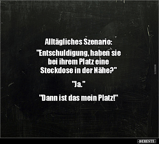 Alltägliches Szenario: "Entschuldigung, haben sie bei ihrem Platz eine Steckdose in der Nähe?" "Ja." "Dann ist das mein Platz!"
