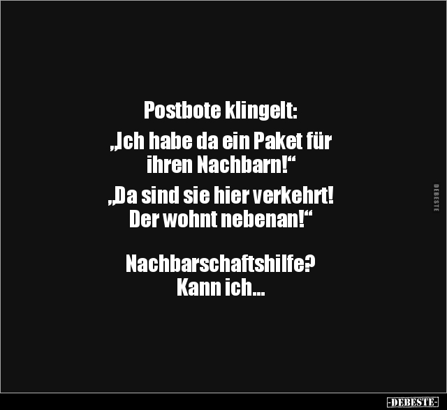 Postbote klingelt: „Ich habe da ein Paket für ihren Nachbarn!“ „Da sind sie hier verkehrt! Der wohnt nebenan!“ Nachbarschaftshilfe? Kann ich...