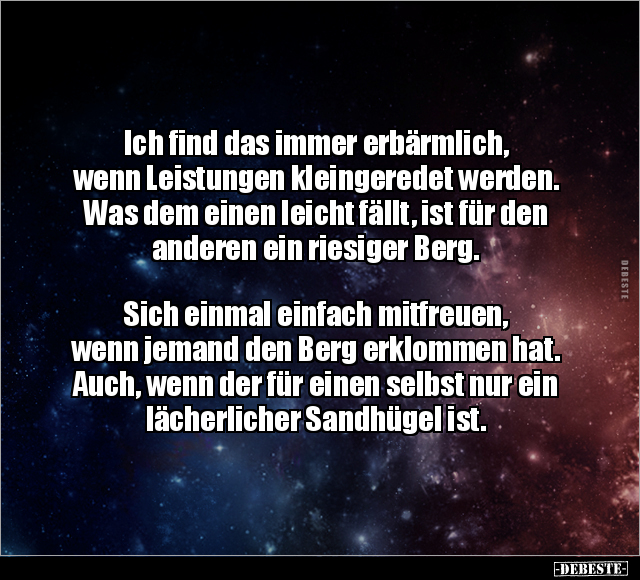 Ich find das immer erbärmlich, wenn Leistungen kleingeredet werden. Was dem einen leicht fällt, ist für den anderen ein riesiger Berg. Sich einmal einfach mitfreuen, wenn jemand den Berg erklommen hat. Auch, wenn der für einen selbst nur ein lächerlicher Sandhügel ist.