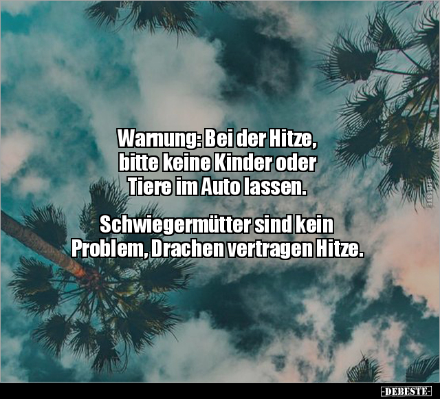 Warnung: Bei der Hitze, bitte keine Kinder oder Tiere im Auto lassen. Schwiegermütter sind kein Problem, Drachen vertragen Hitze.
