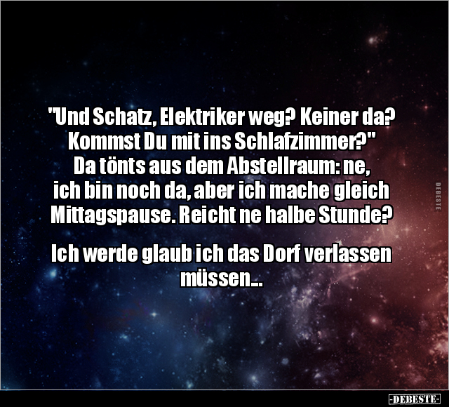 "Und Schatz, Elektriker weg? Keiner da? Kommst Du mit ins Schlafzimmer?" Da tönts aus dem Abstellraum: ne, ich bin noch da, aber ich mache gleich Mittagspause. Reicht ne halbe Stunde? Ich werde glaub ich das Dorf verlassen müssen...