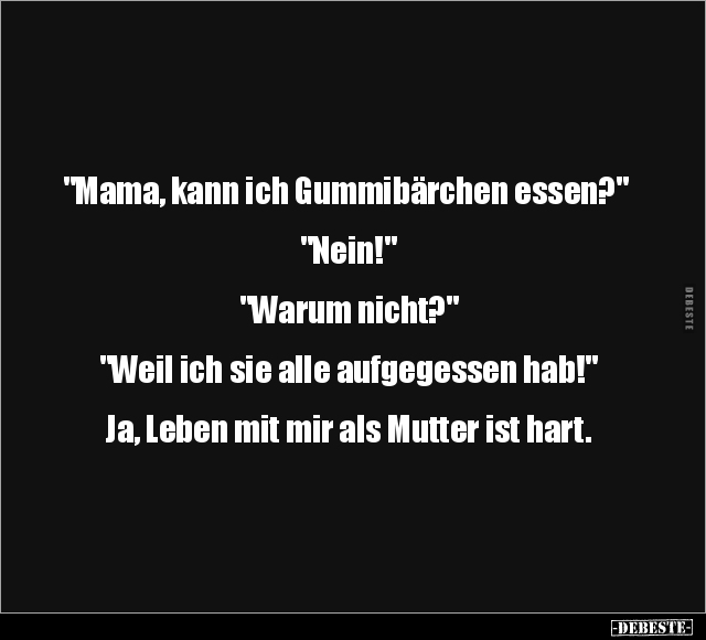 "Mama, kann ich Gummibärchen essen?" "Nein!" "Warum nicht?" "Weil ich sie alle aufgegessen hab!" Ja, Leben mit mir als Mutter ist hart.