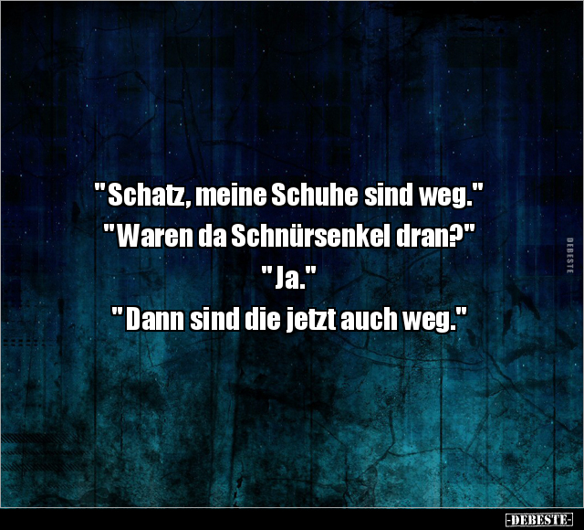 " Schatz, meine Schuhe sind weg." " Waren da Schnürsenkel dran?" " Ja." " Dann sind die jetzt auch weg."