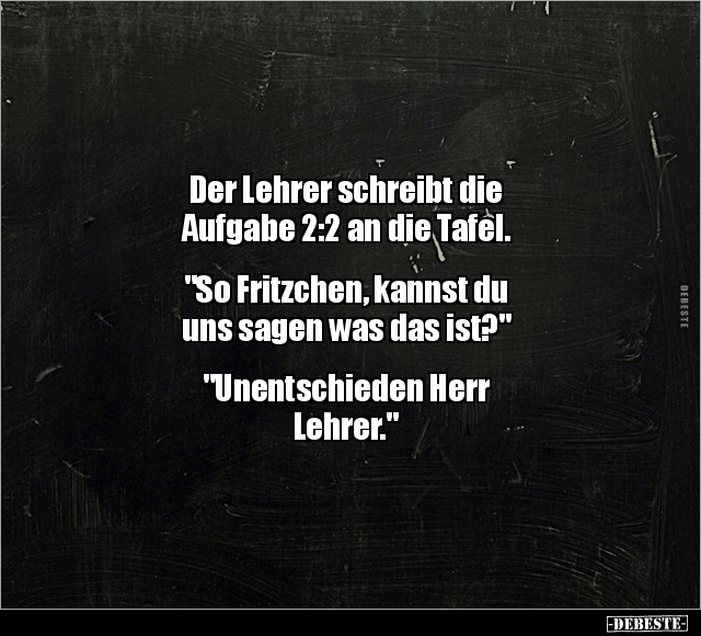 Der Lehrer schreibt die Aufgabe 2:2 an die Tafel. "So Fritzchen, kannst du uns sagen was das ist?" "Unentschieden Herr Lehrer."