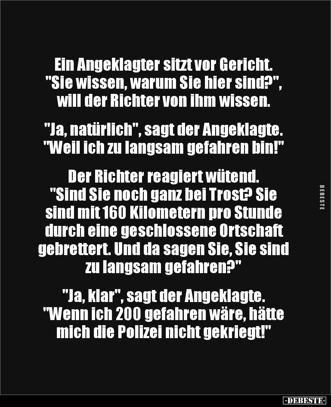 Ein Angeklagter sitzt vor Gericht. "Sie wissen, warum Sie hier sind?", will der Richter von ihm wissen. "Ja, natürlich", sagt der Angeklagte. "Weil ich zu langsam gefahren bin!" Der Richter reagiert wütend. "Sind Sie noch ganz bei Trost? Sie sind mit 160 Kilometern pro Stunde durch eine geschlossene Ortschaft gebrettert. Und da sagen Sie, Sie sind zu langsam gefahren?" "Ja, klar", sagt der Angeklagte. "Wenn ich 200 gefahren wäre, hätte mich die Polizei nicht gekriegt!"