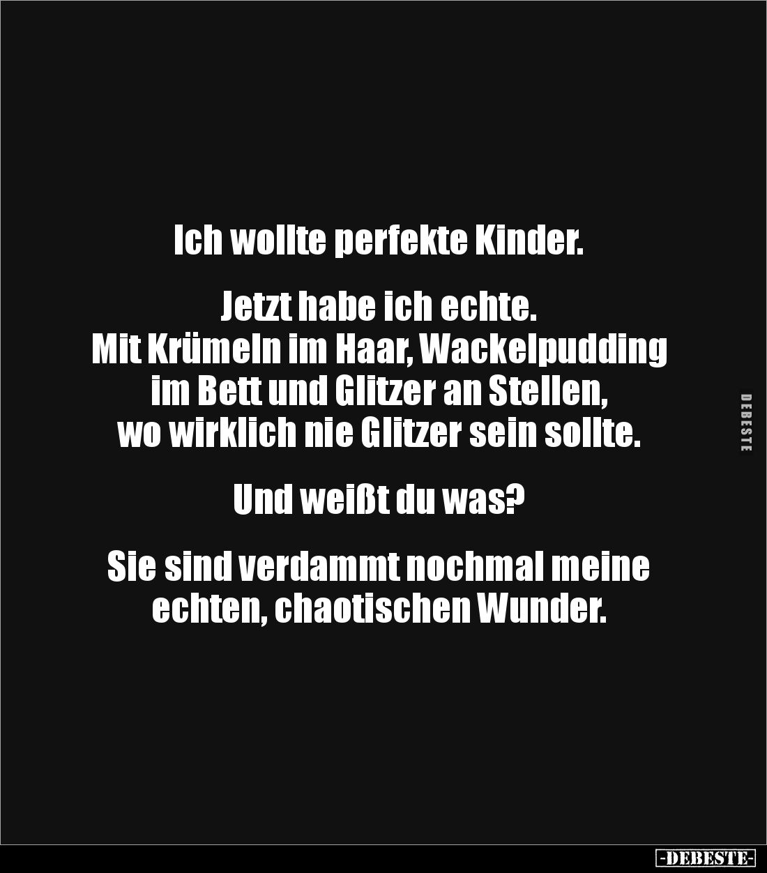 Ich wollte perfekte Kinder. Jetzt habe ich echte. Mit Krümeln im Haar, Wackelpudding im Bett und Glitzer an Stellen, wo wirklich nie Glitzer sein sollte. Und weißt du was? Sie sind verdammt nochmal meine echten, chaotischen Wunder.