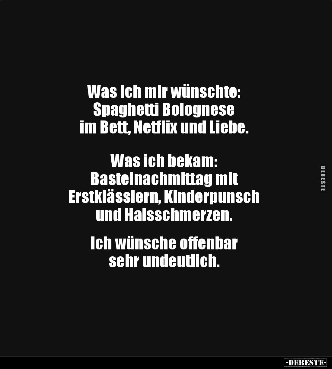 Was ich mir wünschte: Spaghetti Bolognese im Bett, Netflix und Liebe. Was ich bekam: Bastelnachmittag mit Erstklässlern, Kinderpunsch und Halsschmerzen. Ich wünsche offenbar sehr undeutlich.