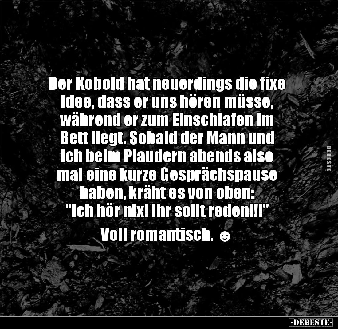 Der Kobold hat neuerdings die fixe Idee, dass er uns hören müsse, während er zum Einschlafen im Bett liegt. Sobald der Mann und ich beim Plaudern abends also mal eine kurze Gesprächspause haben, kräht es von oben: "Ich hör nix! Ihr sollt reden!!!" Voll romantisch. ☻