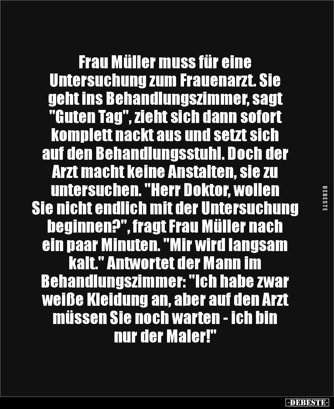 Frau Müller muss für eine Untersuchung zum Frauenarzt. Sie geht ins Behandlungszimmer, sagt "Guten Tag", zieht sich dann sofort komplett nackt aus und setzt sich auf den Behandlungsstuhl. Doch der Arzt macht keine Anstalten, sie zu untersuchen. "Herr Doktor, wollen Sie nicht endlich mit der Untersuchung beginnen?", fragt Frau Müller nach ein paar Minuten. "Mir wird langsam kalt." Antwortet der Mann im Behandlungszimmer: "Ich habe zwar weiße Kleidung an, aber auf den Arzt müssen Sie noch warten - ich bin nur der Maler!"