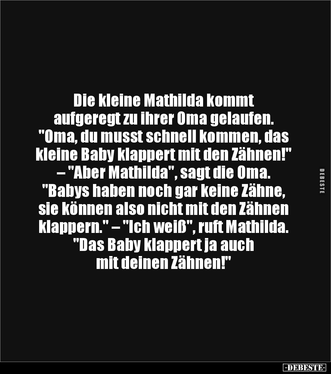 Die kleine Mathilda kommt aufgeregt zu ihrer Oma gelaufen. "Oma, du musst schnell kommen, das kleine Baby klappert mit den Zähnen!" – "Aber Mathilda", sagt die Oma. "Babys haben noch gar keine Zähne, sie können also nicht mit den Zähnen klappern." – "Ich weiß", ruft Mathilda. "Das Baby klappert ja auch mit deinen Zähnen!"