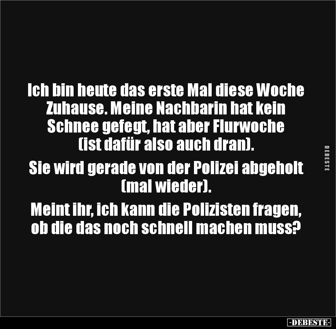 Ich bin heute das erste Mal diese Woche Zuhause. Meine Nachbarin hat kein Schnee gefegt, hat aber Flurwoche (ist dafür also auch dran). Sie wird gerade von der Polizei abgeholt (mal wieder). Meint ihr, ich kann die Polizisten fragen, ob die das noch schnell machen muss?