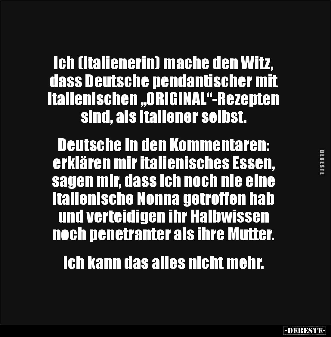 Ich (Italienerin) mache den Witz, dass Deutsche pendantischer mit italienischen „ORIGINAL“-Rezepten sind, als Italiener selbst. Deutsche in den Kommentaren: erklären mir italienisches Essen, sagen mir, dass ich noch nie eine italienische Nonna getroffen hab und verteidigen ihr Halbwissen noch penetranter als ihre Mutter. Ich kann das alles nicht mehr.