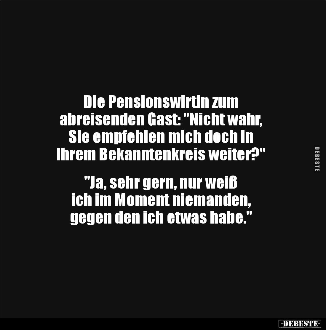 Die Pensionswirtin zum abreisenden Gast: "Nicht wahr, Sie empfehlen mich doch in Ihrem Bekanntenkreis weiter?" "Ja, sehr gern, nur weiß ich im Moment niemanden, gegen den ich etwas habe."