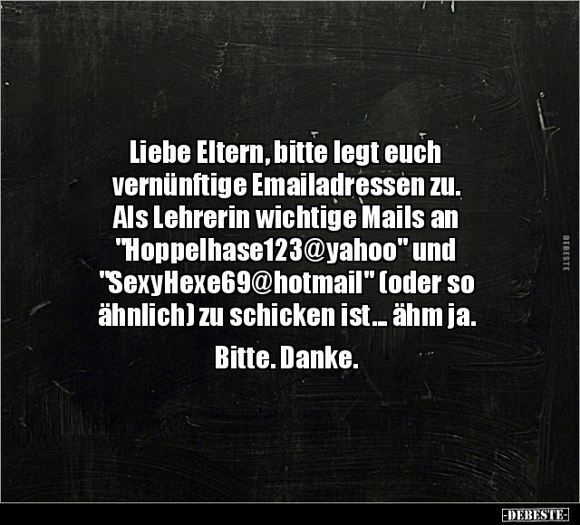 Liebe Eltern, bitte legt euch vernünftige Emailadressen zu. Als Lehrerin wichtige Mails an "Hoppelhase123@yahoo" und "SexyHexe69@hotmail" (oder so ähnlich) zu schicken ist... ähm ja. Bitte. Danke.