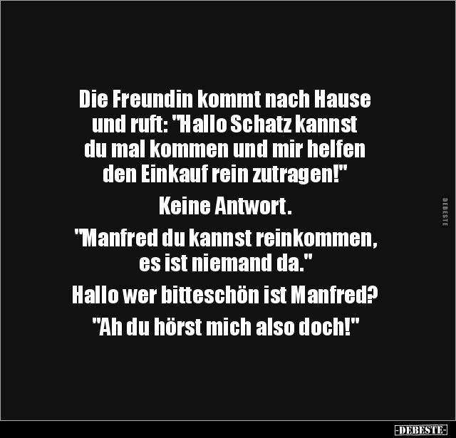 Die Freundin kommt nach Hause und ruft: "Hallo Schatz kannst du mal kommen und mir helfen den Einkauf rein zutragen!" Keine Antwort. "Manfred du kannst reinkommen, es ist niemand da." Hallo wer bitteschön ist Manfred? "Ah du hörst mich also doch!"