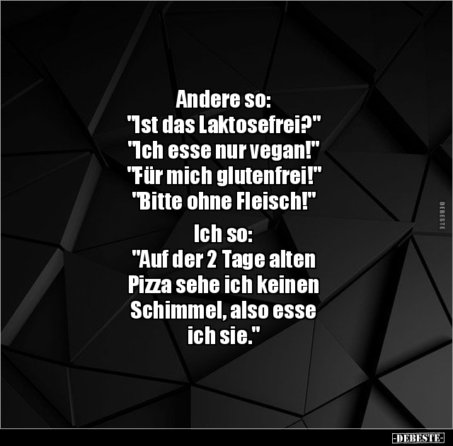 Andere so: "Ist das Laktosefrei?" "Ich esse nur vegan!" "Für mich glutenfrei!" "Bitte ohne Fleisch!" Ich so: "Auf der 2 Tage alten Pizza sehe ich keinen Schimmel, also esse ich sie."