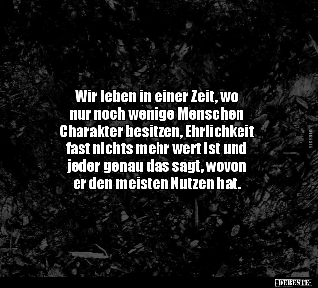 Wir leben in einer Zeit, wo nur noch wenige Menschen Charakter besitzen, Ehrlichkeit fast nichts mehr wert ist und jeder genau das sagt, wovon er den meisten Nutzen hat.