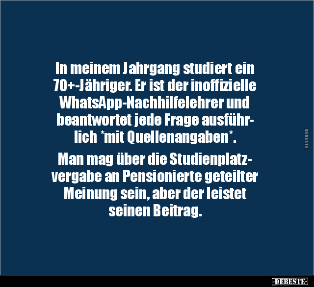 In meinem Jahrgang studiert ein 70+-Jähriger. Er ist der inoffizielle WhatsApp-Nachhilfelehrer und beantwortet jede Frage ausführ- lich *mit Quellenangaben*. Man mag über die Studienplatz- vergabe an Pensionierte geteilter Meinung sein, aber der leistet seinen Beitrag.