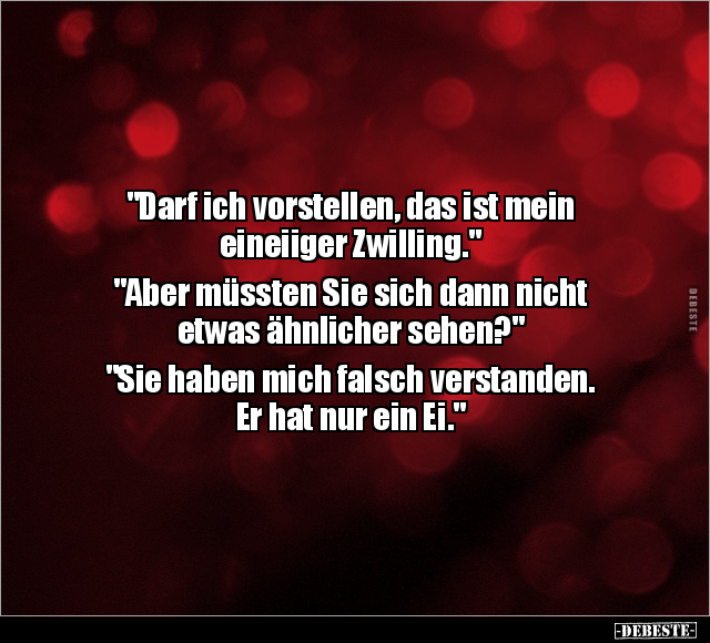 "Darf ich vorstellen, das ist mein eineiiger Zwilling." "Aber müssten Sie sich dann nicht etwas ähnlicher sehen?" "Sie haben mich falsch verstanden. Er hat nur ein Ei."