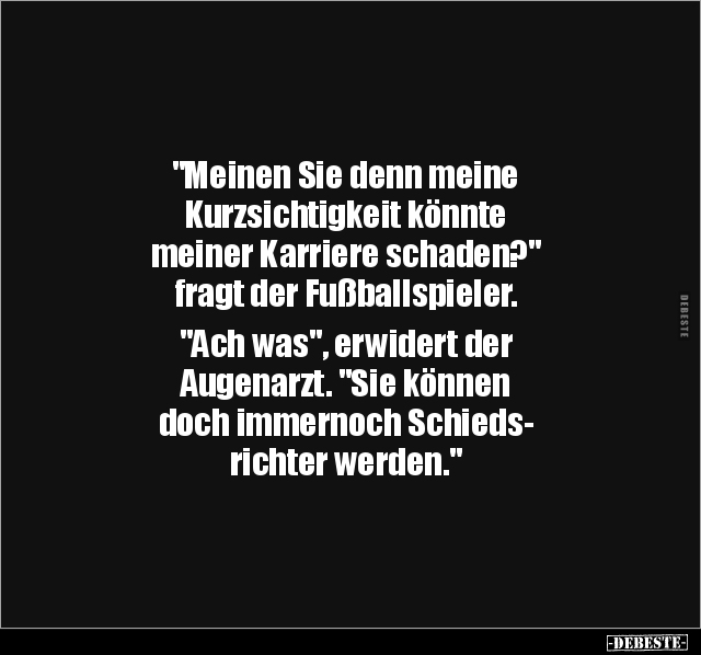 "Meinen Sie denn meine Kurzsichtigkeit könnte meiner Karriere schaden?" fragt der Fußballspieler. "Ach was", erwidert der Augenarzt. "Sie können doch immernoch Schieds- richter werden."