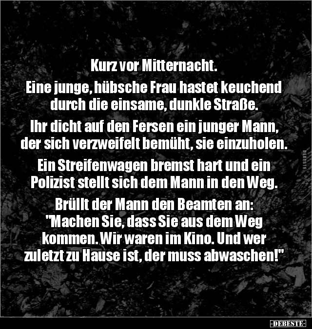 Kurz vor Mitternacht. Eine junge, hübsche Frau hastet keuchend durch die einsame, dunkle Straße. Ihr dicht auf den Fersen ein junger Mann, der sich verzweifelt bemüht, sie einzuholen. Ein Streifenwagen bremst hart und ein Polizist stellt sich dem Mann in den Weg. Brüllt der Mann den Beamten an: "Machen Sie, dass Sie aus dem Weg kommen. Wir waren im Kino. Und wer zuletzt zu Hause ist, der muss abwaschen!"