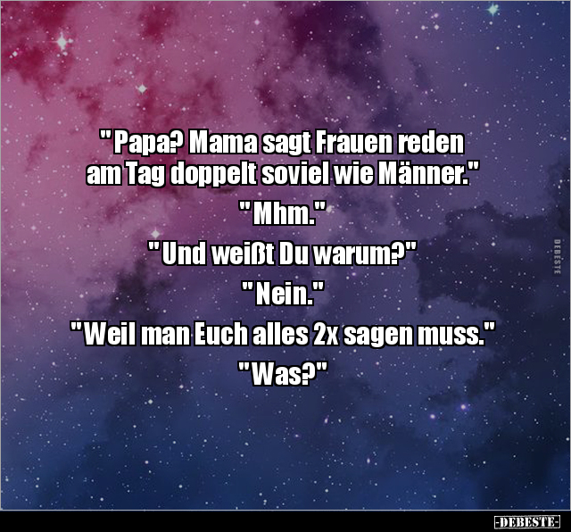 " Papa? Mama sagt Frauen reden am Tag doppelt soviel wie Männer." " Mhm." " Und weißt Du warum?" " Nein." " Weil man Euch alles 2x sagen muss." " Was?"